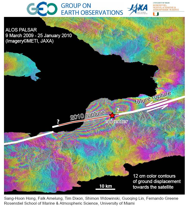 The 12 January 2010 earthquake in Haiti was an exceptional episode of sudden strain release over a wide area. It is not known whether the strain has been totally released along this segment of the Enriquillo-Plaintain Garden fault. Based on localized crustal movements, as well as the known oblique convergence between the North American and Caribbean plates, it would be expected that stress is distributed, not only between the interphases of subduction but also along the major strike-slip faults within the overriding Gonave microplate. Coulomb stress is evident to the segnent east of the stricken area, so an earthquake could occur along this eastern segment in the future. Such progression of Coulomb stress occurs along similar strike stlip faults, as for example the Northern Anatolian fault in Turkey (Pararas-Carayannis, 1999). The JAXA image below (Univ of fMiami) depicts the 2010 rupture and the potential future rupture to the east that may result from stress tranference.