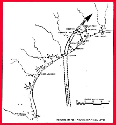 The storm system generated the following surges along the Texas coast: 11 feet at Velasco, 8 feet at Matagorda, 9 feet at Anahuac, and 11.4 feet at Harrisburg in the Houston Ship Channel (Zoch, 1949), and 10.5 feet at Greens Bayou.