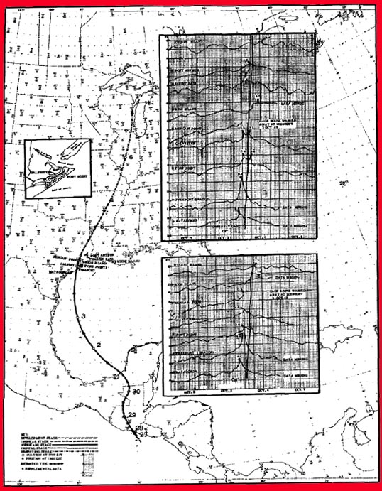The hurricane moved from Yucatan almost directly northward across the Gulf and its center crossed the Texas coast 22 miles southwest of Freeport during the nights of 3 and 4 October. The storm passed Houston in the early morning of 4 October. Winds were estimated at 135 mph, 5 miles west of Freeport (Zoch, 1949), and at 90 mph at Houston).