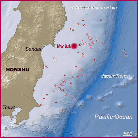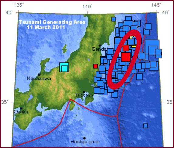 Tsunami Generating Area showing the epicenter of the main earthquake on March 11, 2011, a major aftershock with magnitude 7.1 fifty minutes later and 172 aftershocks which sere recorded by the USGS by March 12, 02:04:53 UTC 2011