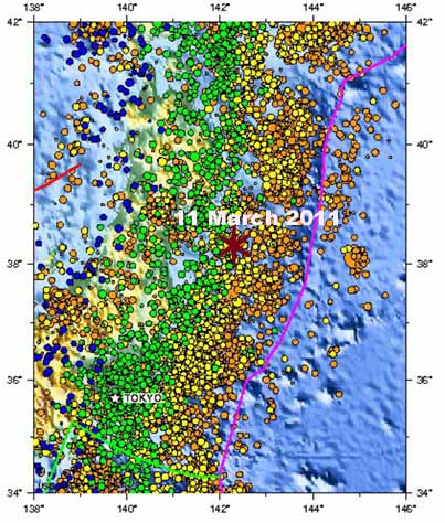 Seismicity of Japan - Epicenters of earthquakes on the Island of Honshu and Southern Hokkaido. Epicenter of the 11 March 2011 earthquake