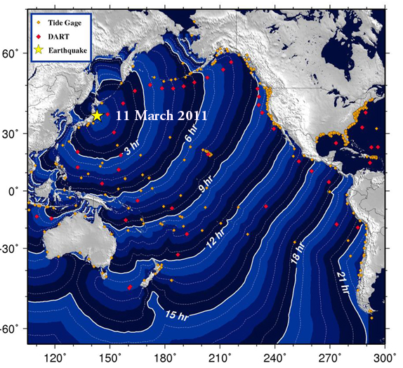 Travel Time Chart of the March 11, 2011 Tsunami in hours (modified NOAA graphic)