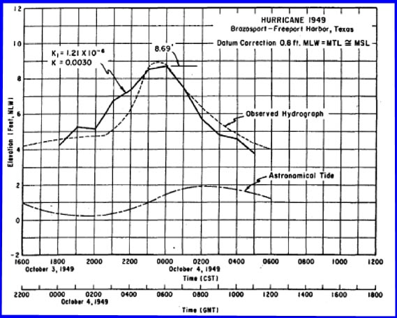 Surface wind fields and pressure fields for this hurricane were obtained from the U.S. Weather Bureau (HUR 7-37, 1957). The report provided hourly wind fields from 1800 hours CST, 3 October to 0500 hours CST, 4 October 1949. These were the synoptic weather charts used in the modeling study. The map below shows the traverses that were used for the calculation of the hurricane's surge. Other parameters of the Hurricane of 3 October 1949 that were used for the computations and the numerical model verification were the hydrographs of surges recorded by the Brazos River and the Galveston tide gauges. For the Freeport traverse the nearest tidal station which recorded the hurricane surge was at Brazos River Gates. The Brazos River station is located 1.2 nautical miles inland from the Gulf of Mexico, near Freeport, where the Brazos River and the Intracoastal Waterway intersect.