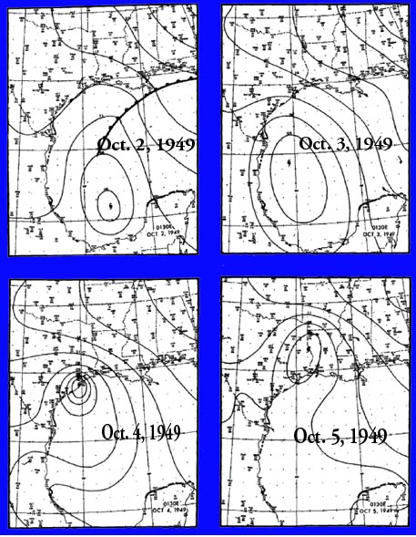 This hurricane (unamed in 1949) formed in the Bay of Campeche, Mexico, from a tropical depression which was observed 2 or 3 days before 1 October, over Yucatan, Honduras, and Guatemala. During the night of 30 September and 1 October, the center of the depression moved into the Gulf of Mexico near Carmen, Mexico and increased to Category 4 hurricane intensity by 1045 hours, Central Standard Time (CST), on 2 October.